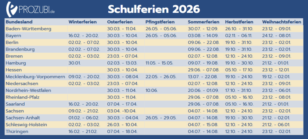 Du weißt nicht, wann in Deinem Bundesland die Schulferien in der Ausbildung sind? Kein Problem, wir haben für Dich die Ferien und Feiertage in jedem Bundesland im Überblick.